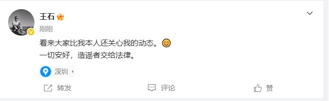 4月12日19:23分,王石在社交媒体发文“看来大家比我本人还关心我的动态。一切安好,造谣者交给法律。”回应被抓传闻。此外,田朴珺也发文表示:这是法治社会,造谣是不需要付出代价的吗?